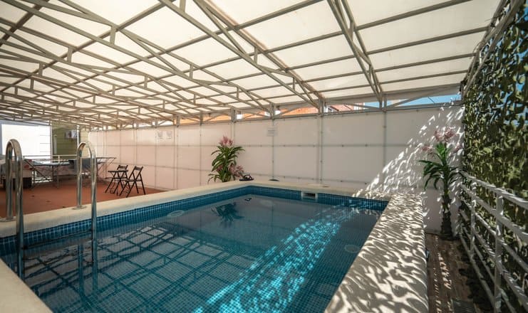 На втором этаже — крытая терраса с зоной отдыха и бассейном с гидромассажем размеры 3*4.