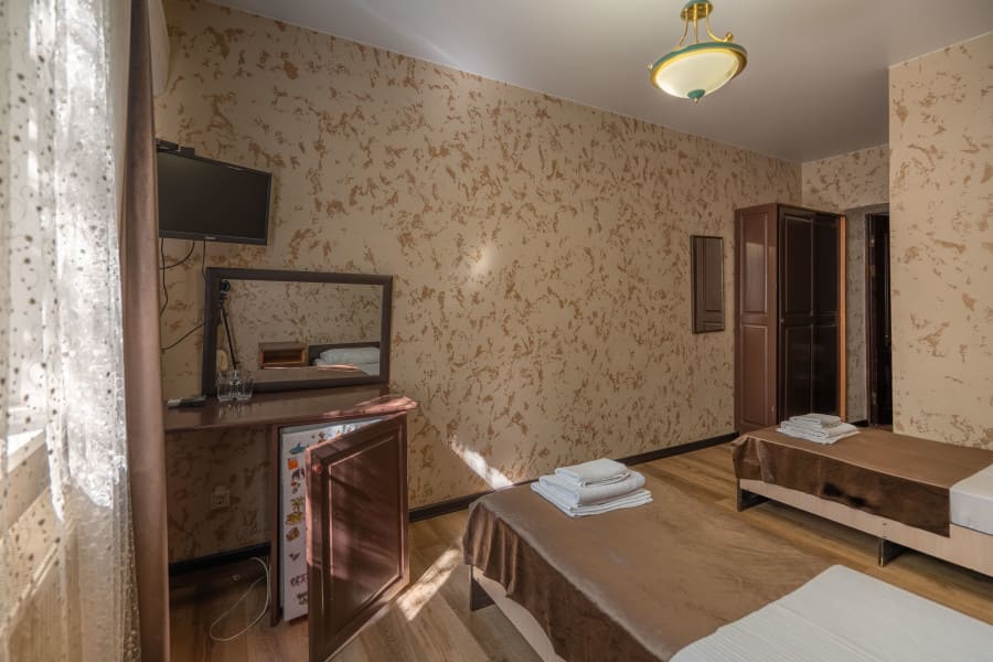 Уборка номеров — по запросу или самостоятельно. Смена полотенец и белья — 1 раз в 3 дня.